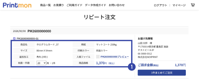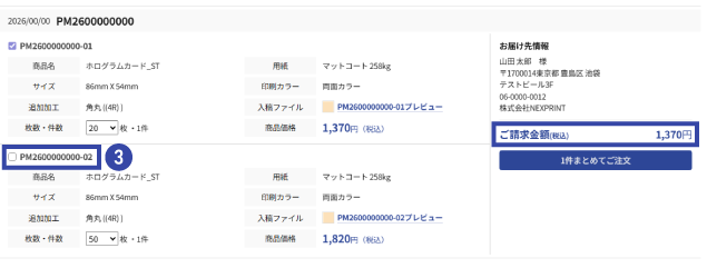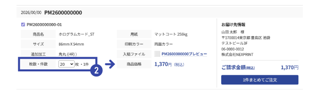 用紙、サイズ、印刷カラー、加工、入稿ファイル、枚数、お届け先情報はすべて同じように注文を生成します。