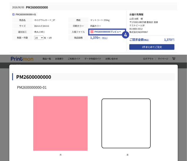 4 また、入稿データはプレビュー画面に表示されますので、リピート注文の際に入稿データの画像もご確認いただけます。