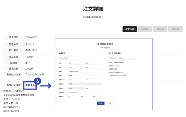 6 「変更する」をクリックして【発送情報の変更】ページで修正した後、「保存」をクリックしてください。
