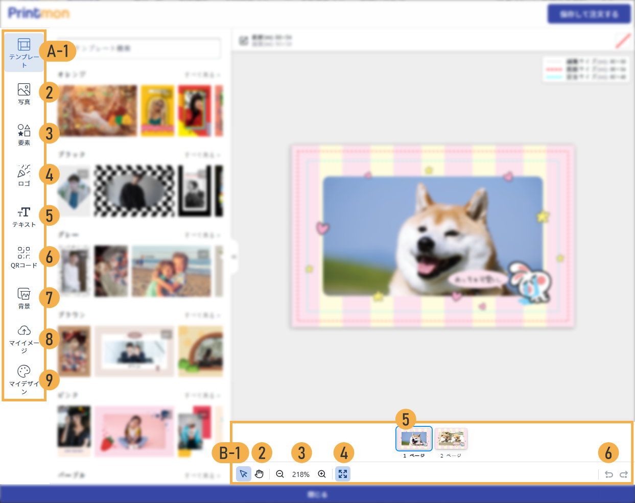 B-1選択ツール:オブジェクト(写真や文字)を選択・移動する際に使用します。