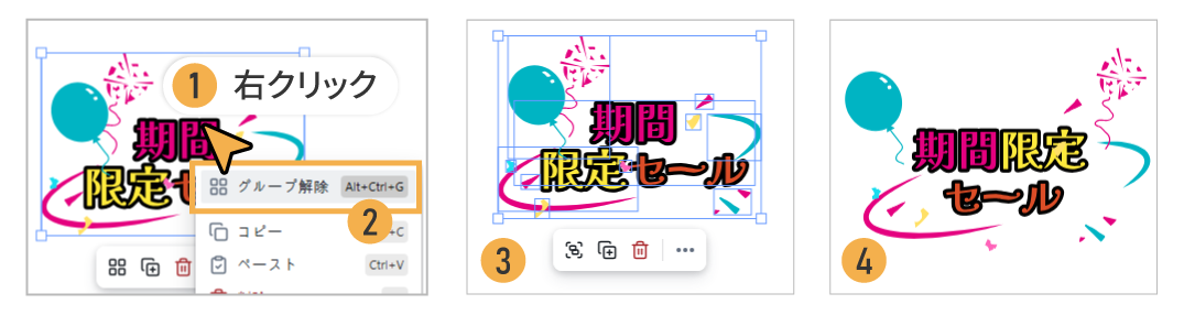 3グループを解除すると、テキストや背景の装飾などを個別に選択できるようになります。