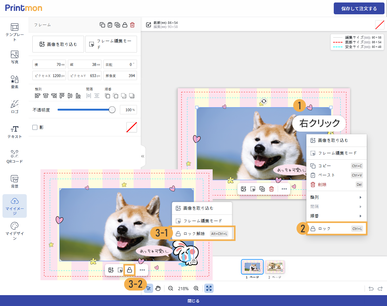 3ロックを解除したい場合は、同様に右クリックメニューから「ロック解除」を選択するか、フレーム下部に表示される「南京錠アイコン」をクリックします。