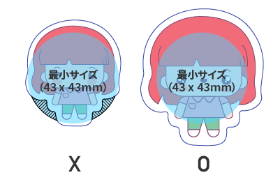 自由形のデータ作成時、カットパスが最小サイズ(43✕43mm)を下回らないよう大きめに作成してください。