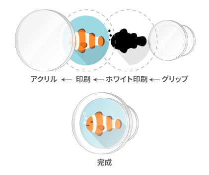 透明アクリル素材を使用し、白引き(ホワイト)印刷のあり・なしを自由に指定できるため、こだわりのデザインをイメージ通りにクリアに再現できます。
